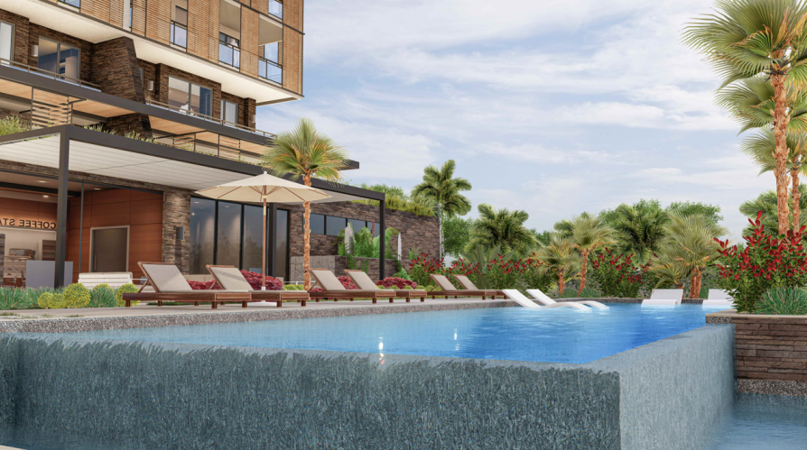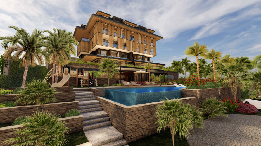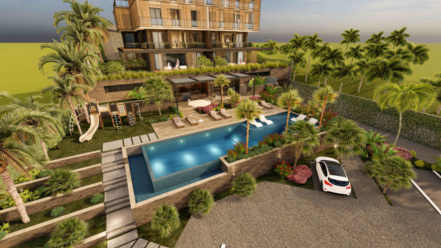 Инфраструктура комплекса: открытый бассейн, джакузи, комната отдыха, сауна, лобби, тренажёрный зал, детская площадка.